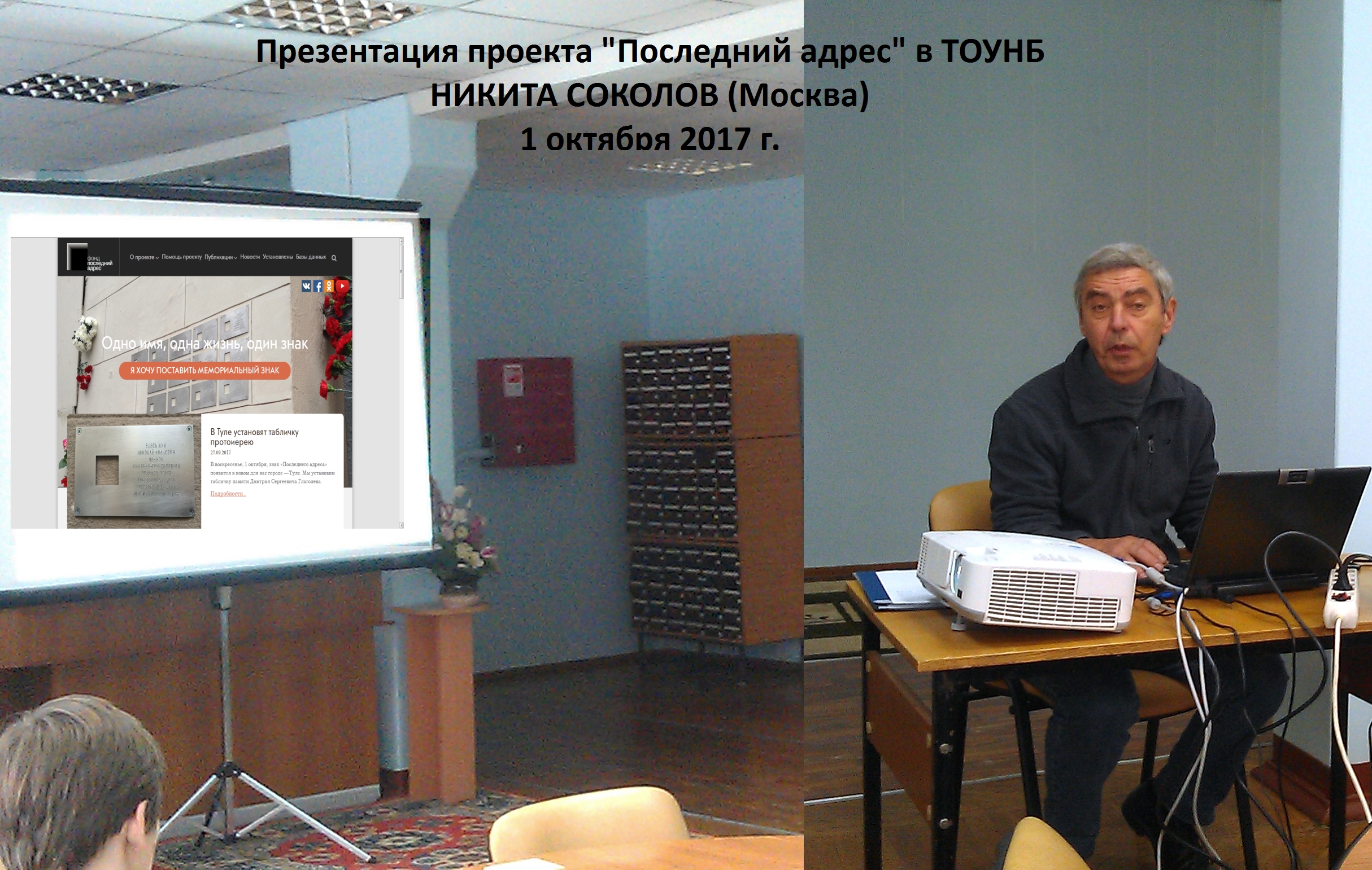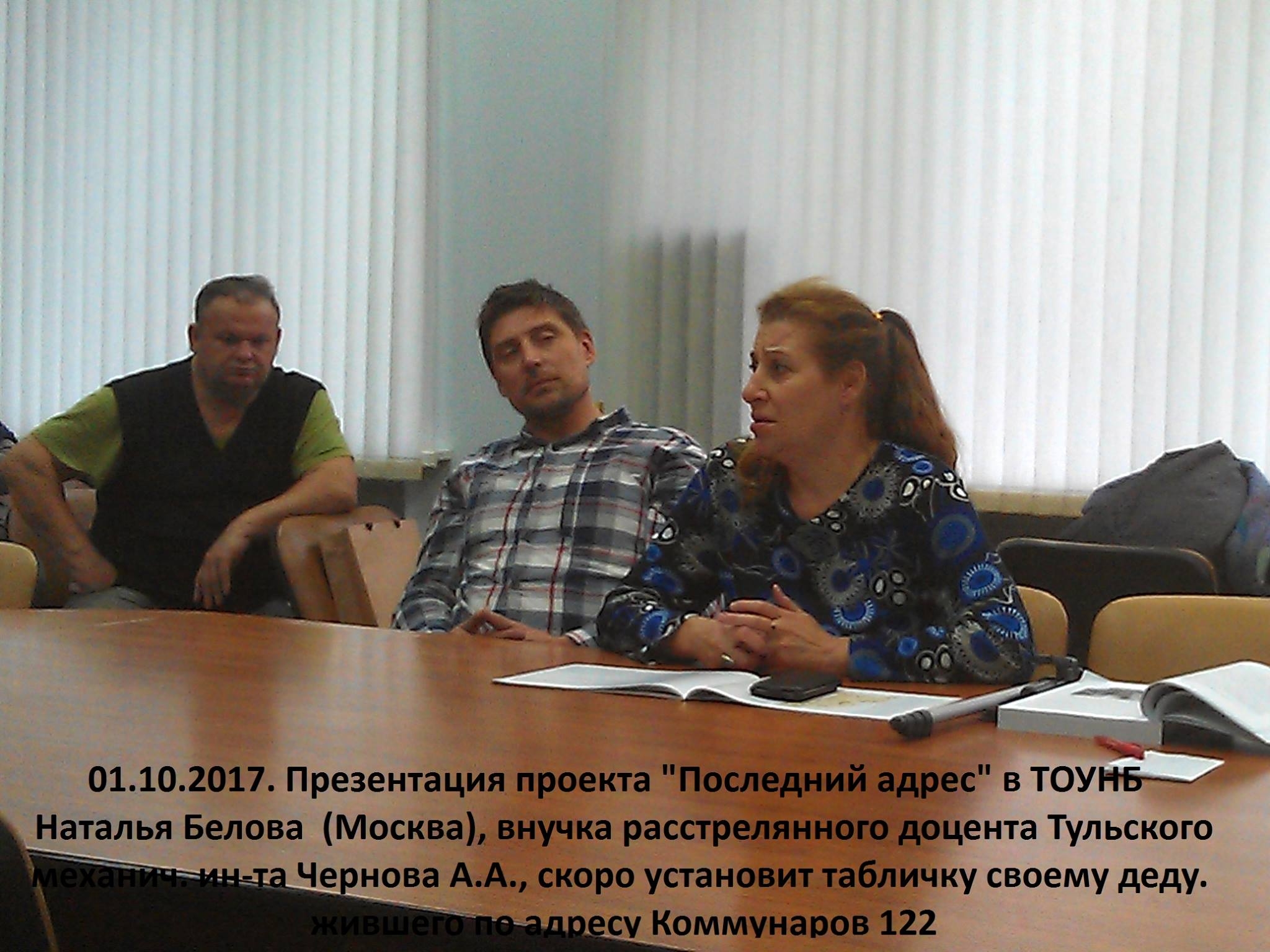 В тот же день, в Тульской областной научной библиотеке, прошла презентация проекта "Последний адрес", которую провел историк Никита Соколов. Потом Тульский "МЕМОРИАЛ" рассказал о проекте "Жители Тулы до и после 1917 г.", целью которого является установление "последних адресов" туляков, пострадавших от репрессий.