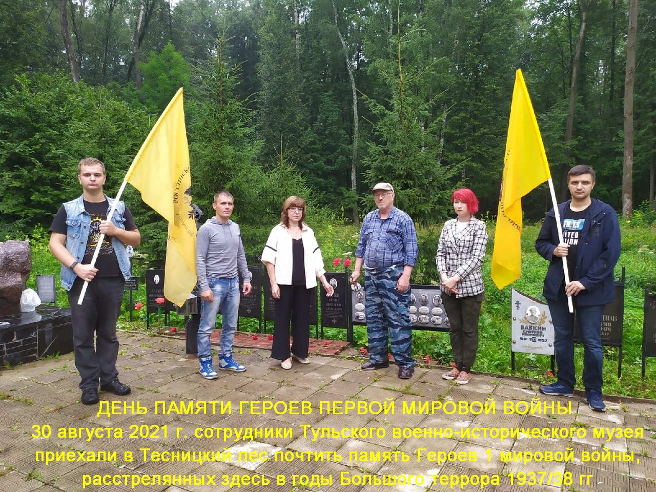 30 августа 2021 г. сотрудники Тульского военно-исторического музея приехали в Тесницкий лес почтить память Героев 1 мировой войны, расстрелянных здесь в годы Большого террора 1937/38 гг. В мероприятии приняли участие члены Тульского "Мемориала" и волонтеры Православного Братства. Совместными усилиями была проведена в порядок территория захоронений, а затем прошла церемония возложения цветов.