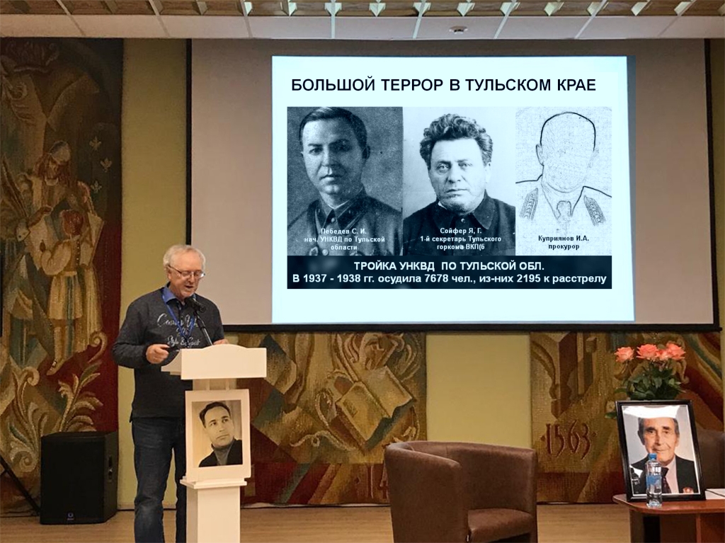 Были затронуты следующие темы: история массовых политических репрессий в Тульском крае и СССР, человеческие судьбы в условиях тоталитарного режима, повседневность и общественное сознание в переломных событиях ХХ века.Доклады были выслушаны с интересом и открыли публике ряд неизвестных эпизодов истории тульского края и судьбах земляков.