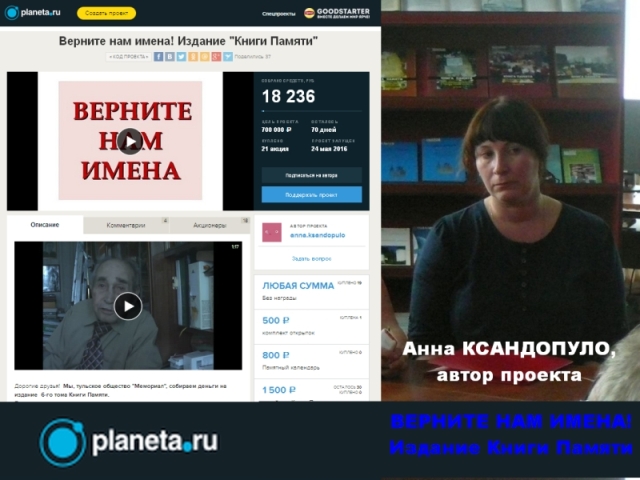 Анна КСАНДОПУЛО, член Иоанно-Предтеченской общины Преображенского братства, организатор компании по сбору средств на издание 6 тома рассказала о своем проекте «Верните нам имена! Издание «Книги Памяти»